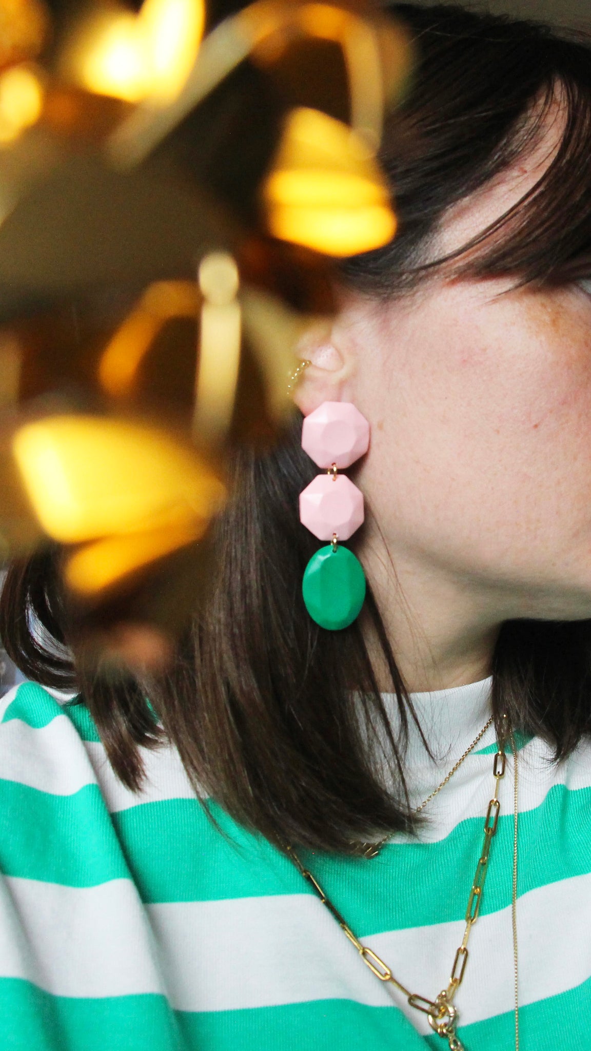 Composition : Pièces en argile polymère. Attaches et anneaux de raccord en acier inoxydable doré.
