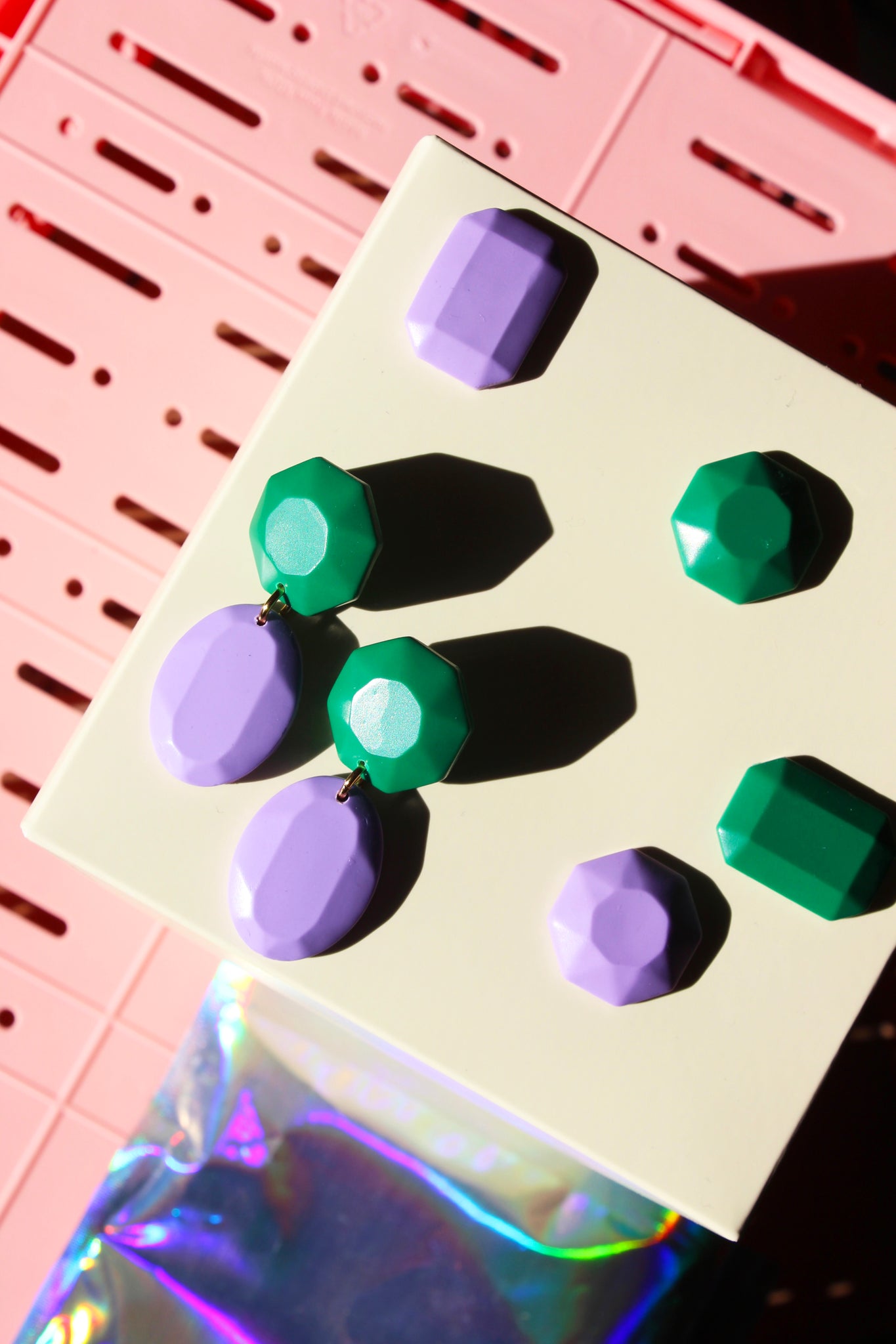 Description : Le gems rose est la pièce qui arrive directement sur le lobe d'oreille. Chaque pièce est ensuite reliée l'une à l'autre par anneaux de raccord. Le motif de la pièce jaune peut varier légèrement car il est effectué entièrement à la main entre un mélange de polymère jaune fluo et transparent.