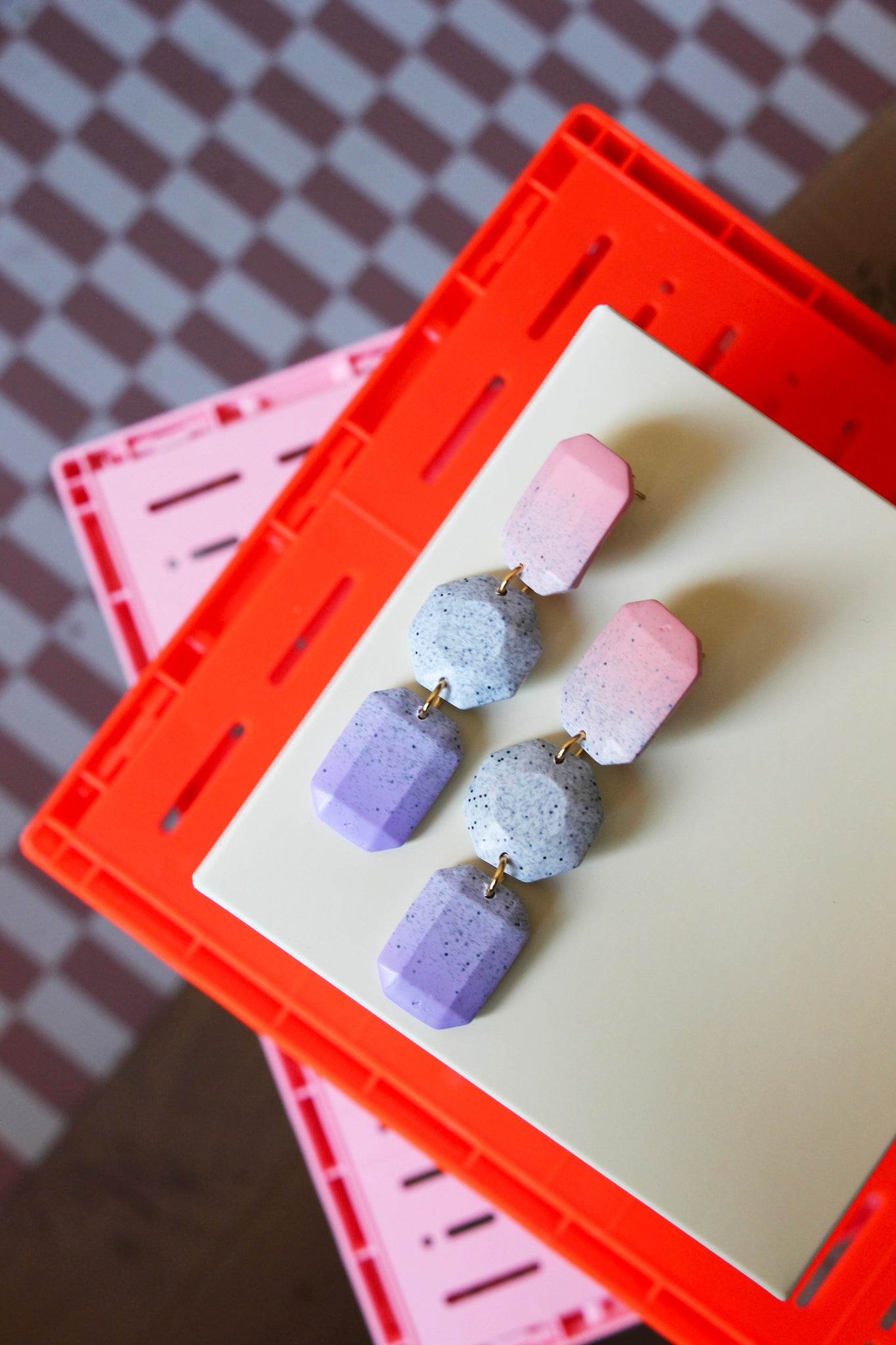 Composition : Pièces en argile polymère. Attaches et anneaux de raccord en acier inoxydable doré.